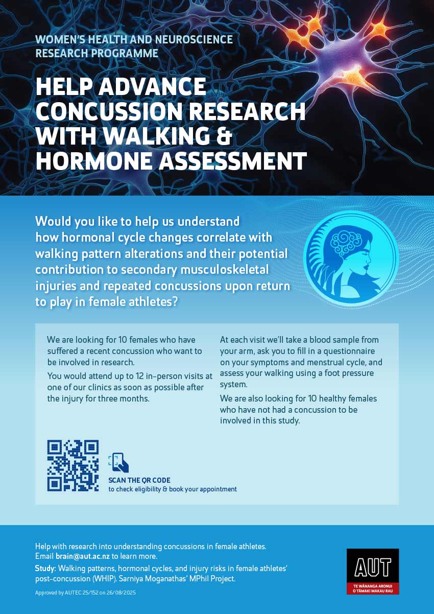 If you have experienced a head knock or suspect you have sustained a concussion, and are interested in participating in this study, we also offer on-site concussion diagnosis every Monday between 12.15pm and 1.15pm at our AUT Millennium Brain Health Hub clinic (level 2) hosted by Dr Sam Wootton (MBBS, FRNZCC). This one-off assessment provides an opportunity for free screening for study inclusion, and where necessary a recommendation for appropriate follow-up care will be made.